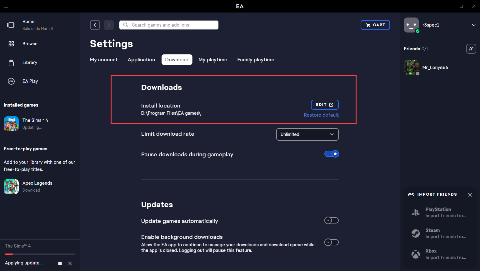 - Open the EA application settings and set the game library location on the game disk as “D:\Program Files\EA games” (Figure 1).