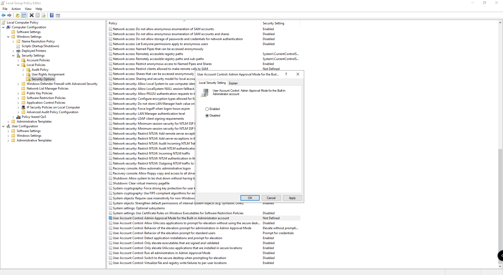 - Find User Account Control: Admin Approval Mode for the Built-in Administrator account and set it to Disabled. (Figure 1)