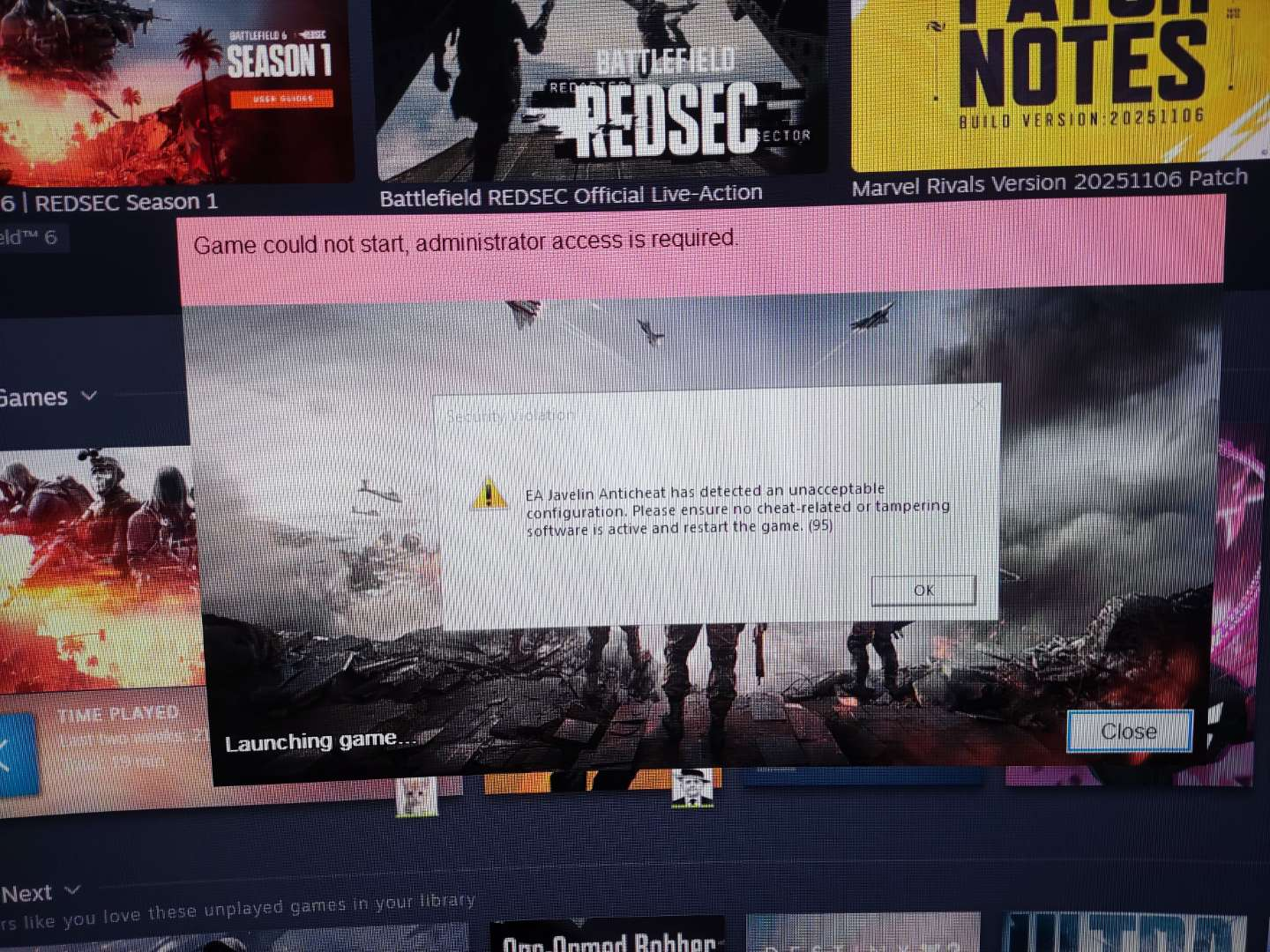 - There is an error with anticheat on Battlefield 6 ‘EA Javelin Anticheat” (Figure 2)