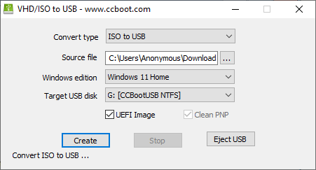 - Open CCVHDUsb.exe and set the Convert Type to “ISO to USB.” Select the source file install.wim (C:\Win11_25H2_English_x64\sources\install.wim), choose Windows Edition as Windows 11 Pro, ensure the USB drive is detected automatically, check the UEFI Image option, and click Create to start the process.