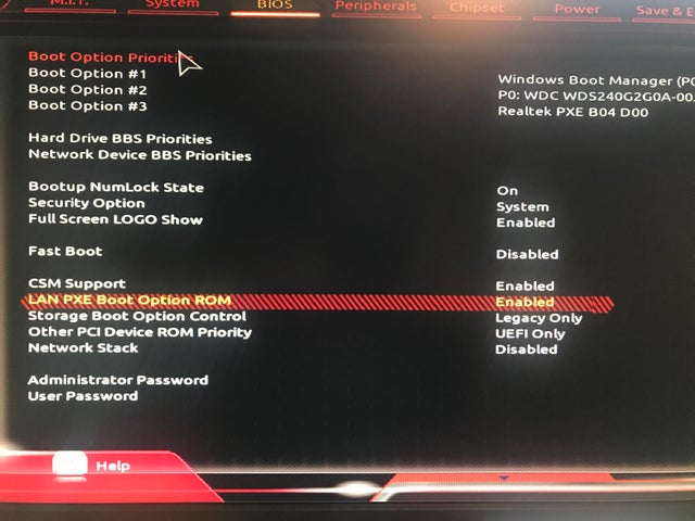 - In "Integrated Peripherals", look for "Lan Option ROM" or "Boot from LAN" or “PXE OpROM” or “Legacy PXE Boot Option ROM” and then change the option to "Enabled"(Figure 2).