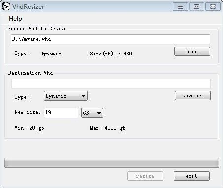 - In VHD Resizer, click the Open button to locate the old VHD file path. Then, click Save As to choose a new path for the resized VHD file. Enter the new disk size in the New Size field and click the Resize button to proceed.(Figure 2)