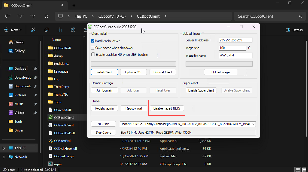 The following steps explain how to disable NDIS in the CCBootClient to prevent the network's NDIS services from affecting the boot time.