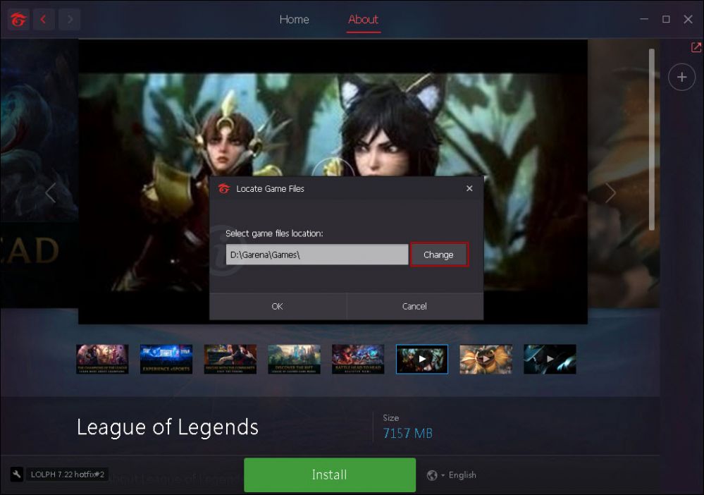 5. Now click "Change" Locate your Garena League of Legends folder on your game disk, example D:\Online Games\GarenaLoLPH\GameData\Apps then click the "select folder" button (Figure 4).