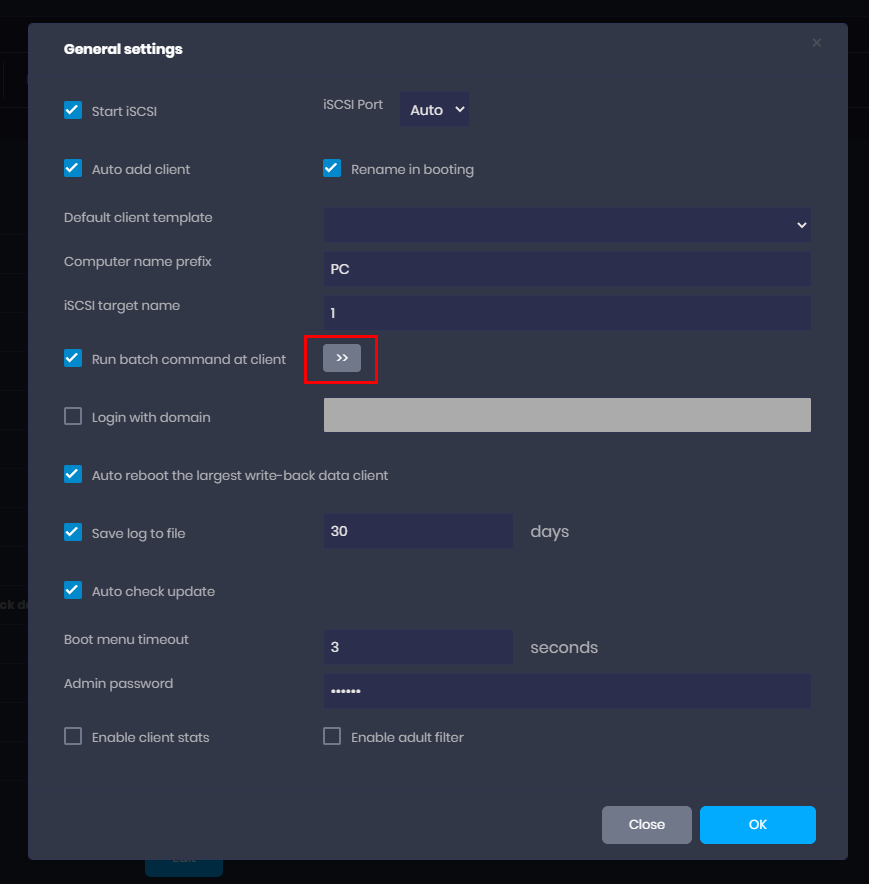 3. Now, open CCBootCloud CP and then the settings, check the checkbox for "Run Batch Command at Client" and then click the '>>" button (Figure 2)