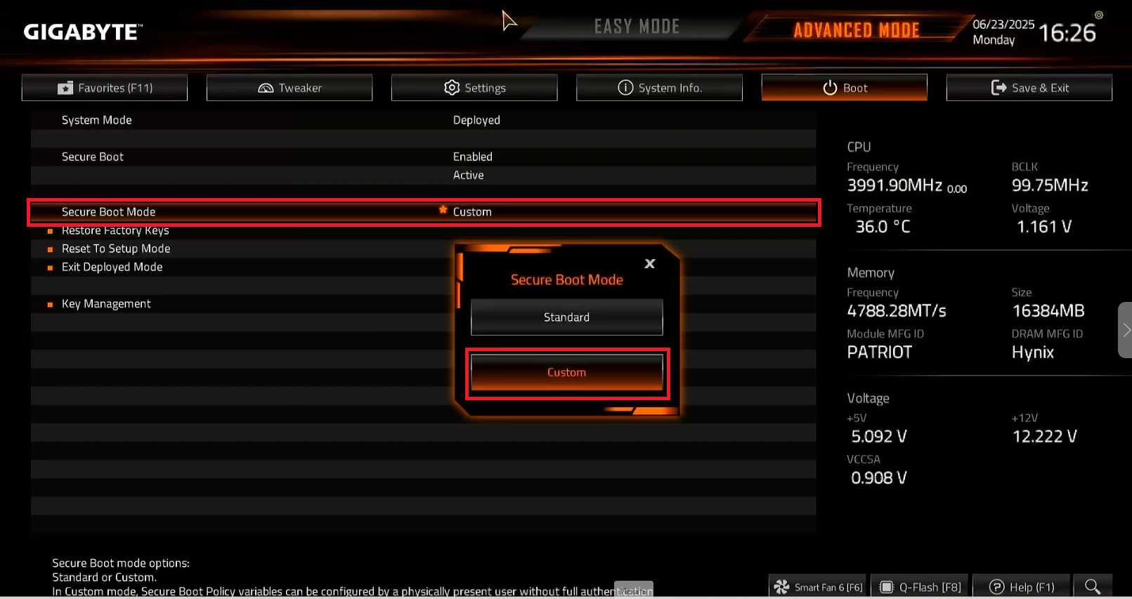 - Change the Secure Boot Mode setting to Custom. (Figure 12)