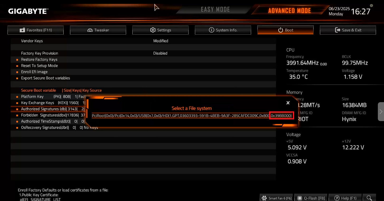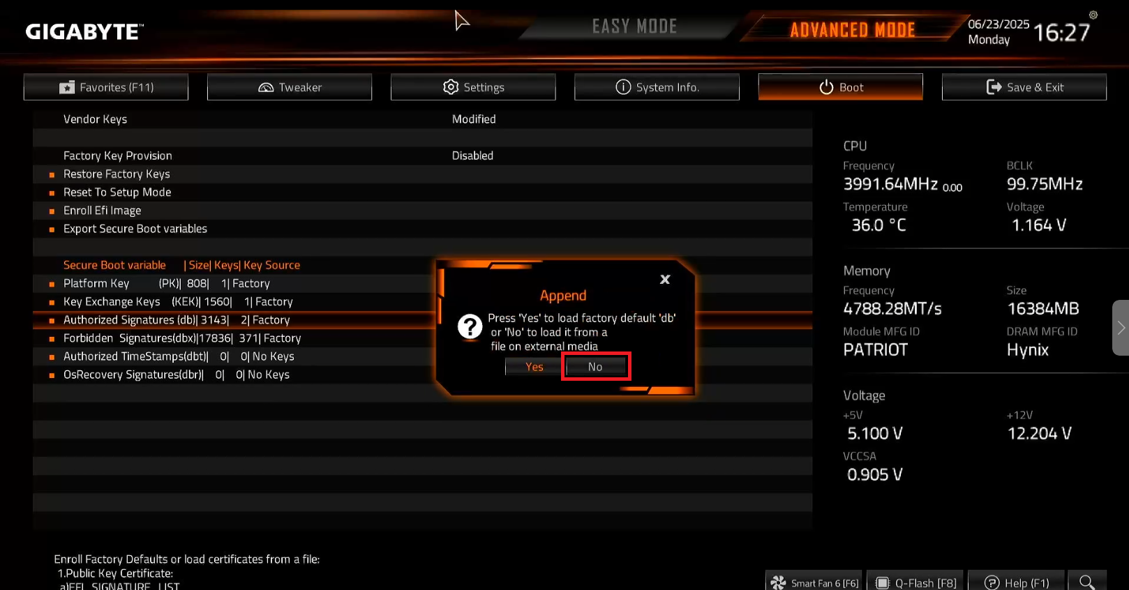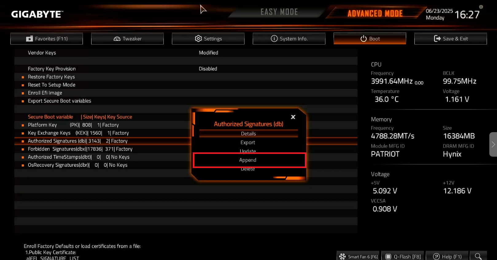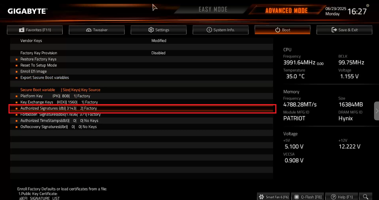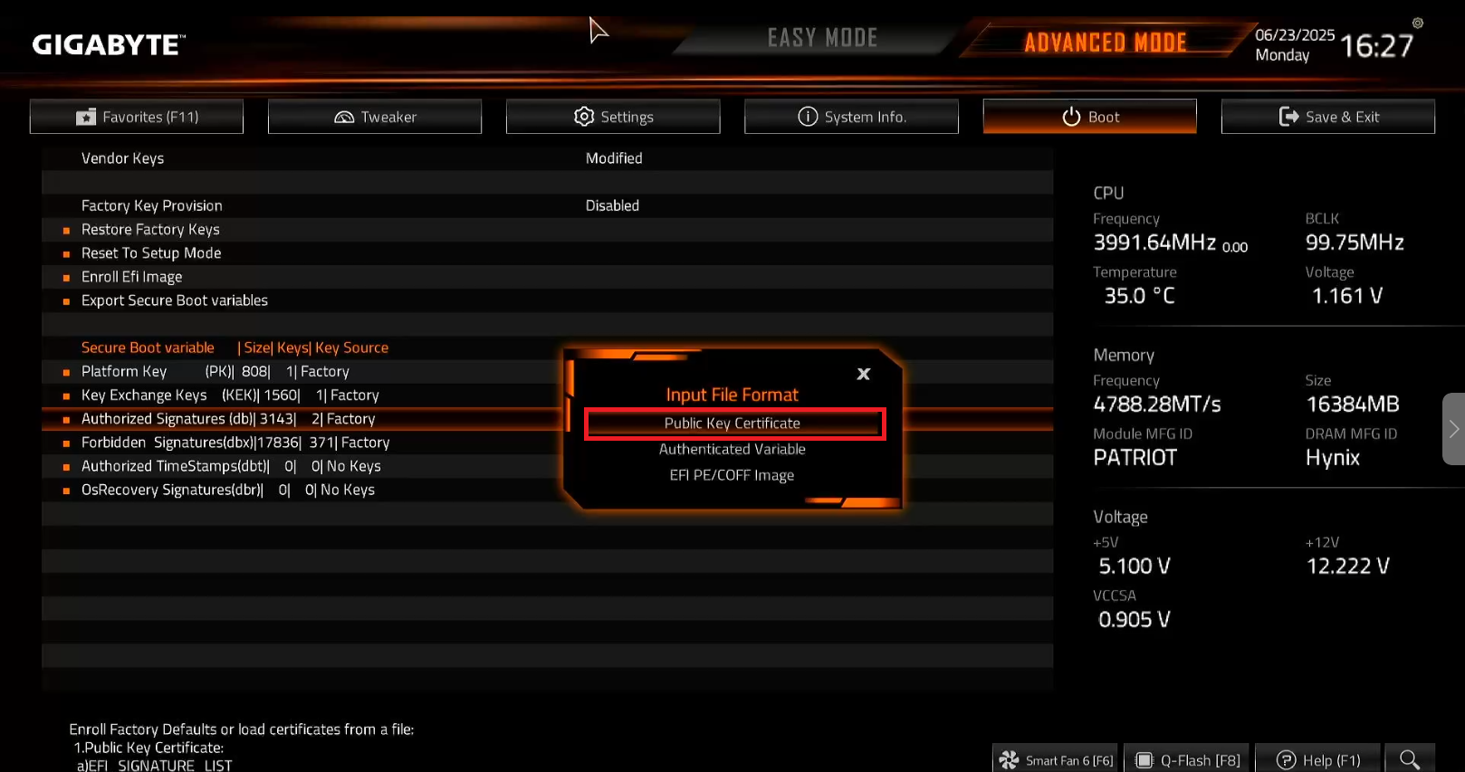 - If no message appears to save after pressing Enter on the Public Key Certificate section, press ESC first. This should allow you to save the changes made in the motherboard settings.