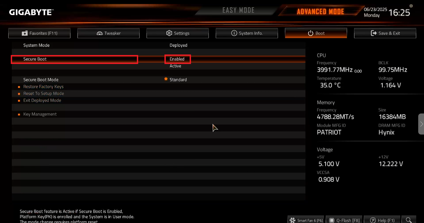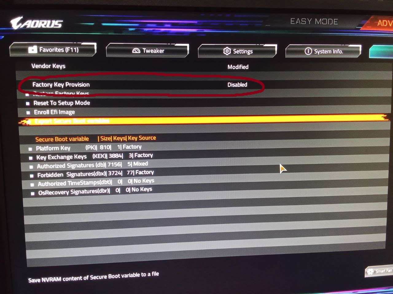 - If your motherboard is Aorus elite, disable “Factory key provision” as it reset the keys on every reboot.(Figure 24)