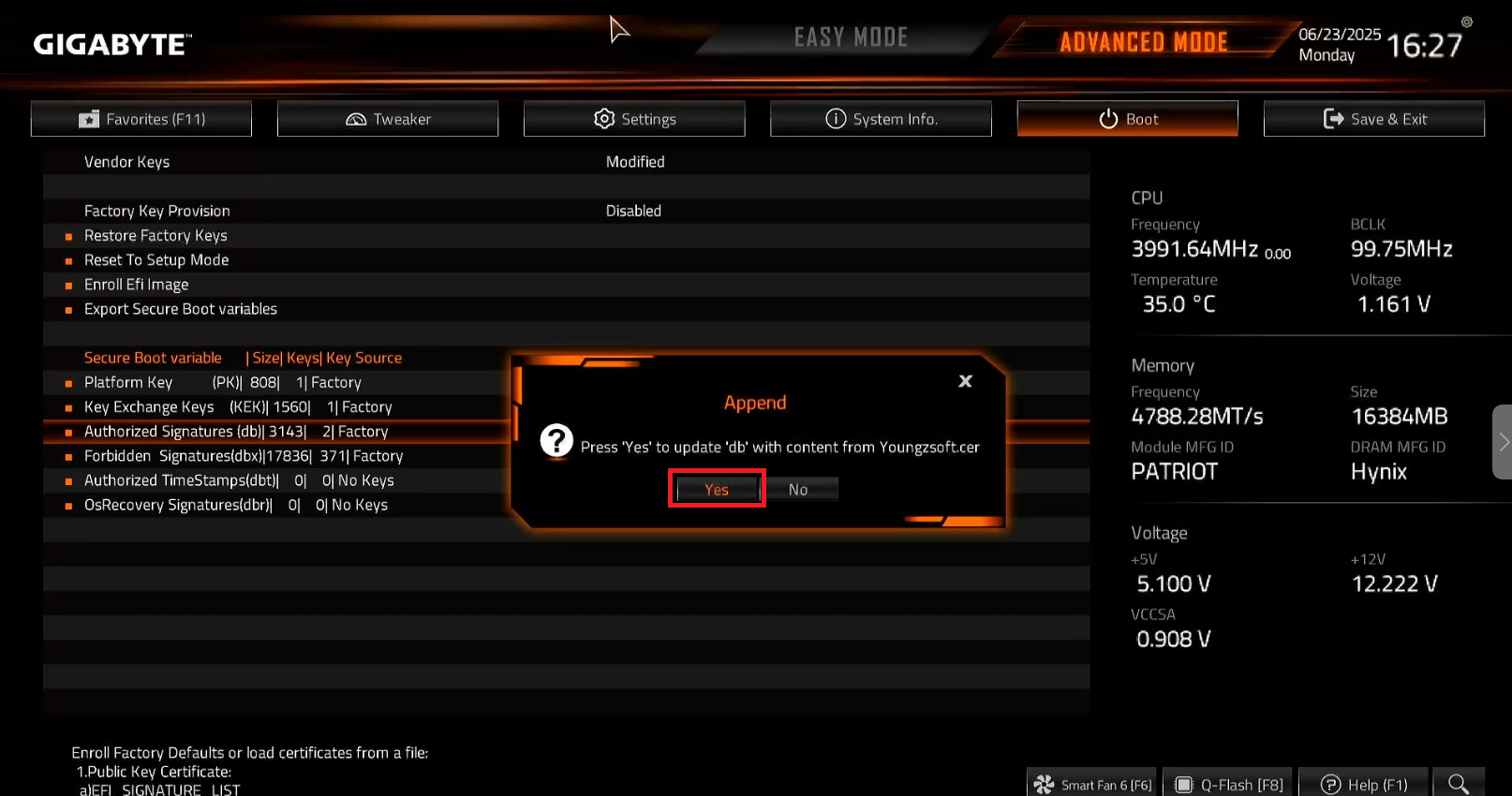 - Instead of attempting to append keys from Youngzsoft.cer, update the authorized keys using the record from the USB drive (on Gigabyte motherboards, this file is typically named "db").