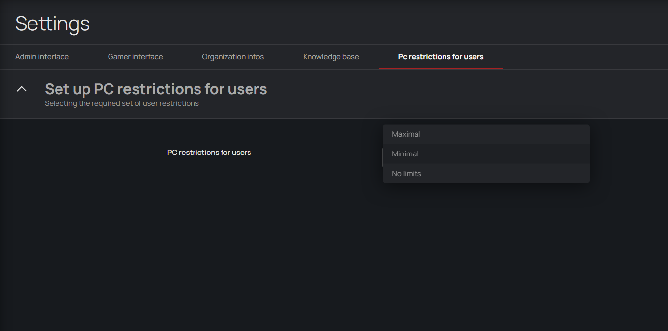 - In the Senet admin panel, navigate to Settings, find the 'Set up PC restriction for users' option, and set it to 'No Limits' (Figure 1)