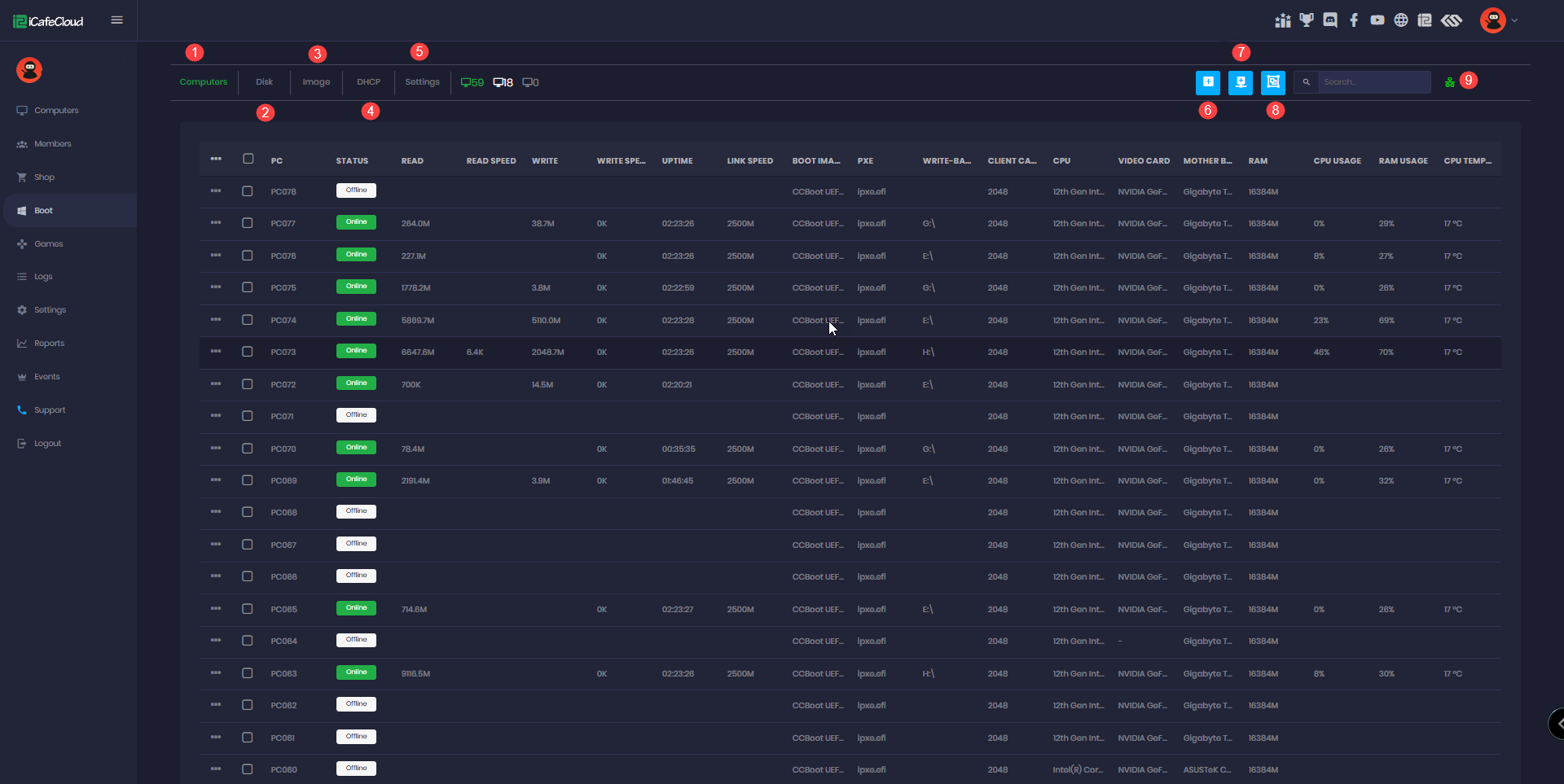 - The icon with 3 PCs shows the status on the CCBootCloud server: green means connected, and grey means disconnected.
