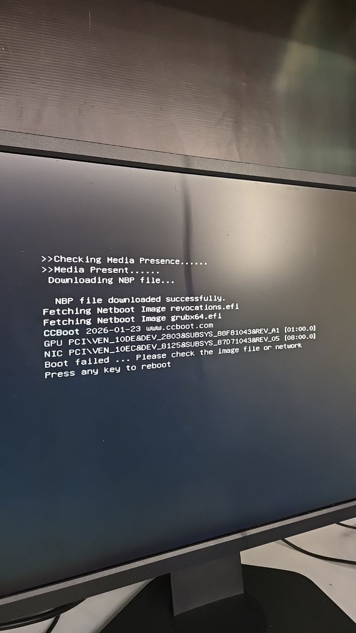 - PC is stuck during boot at the PXE stage, displaying CCBoot information and PnP messages from the NIC and GPU, and then freezes (Figure 1)