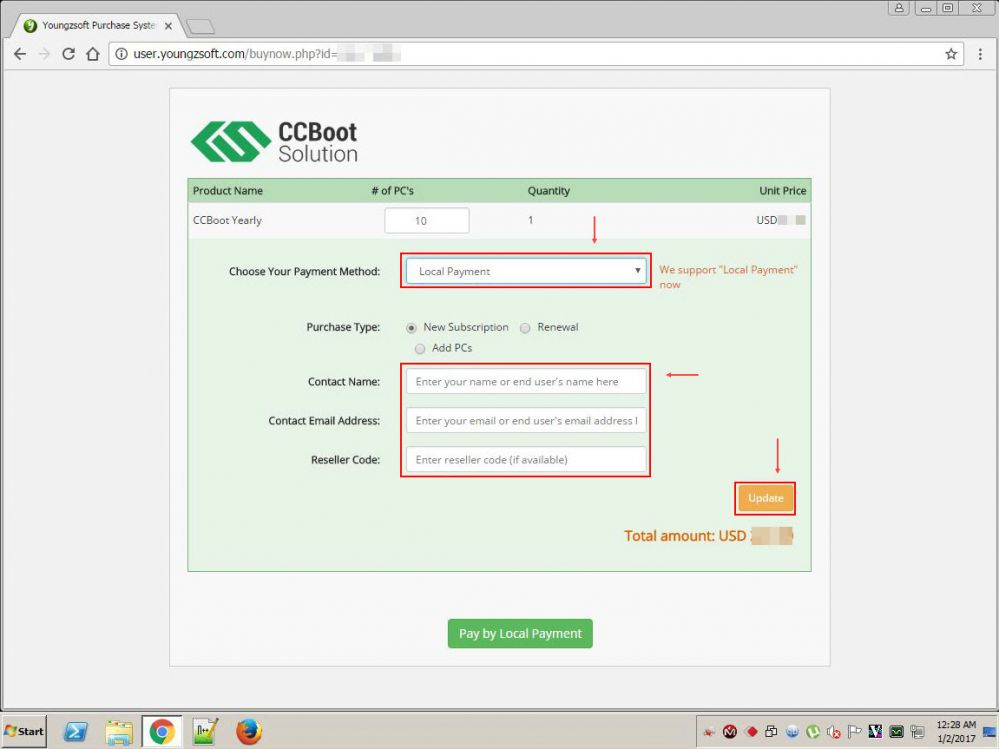 2. Enter desired number of user license you want then enter you Contact Name, Email address and Coupon (if any), then click update.