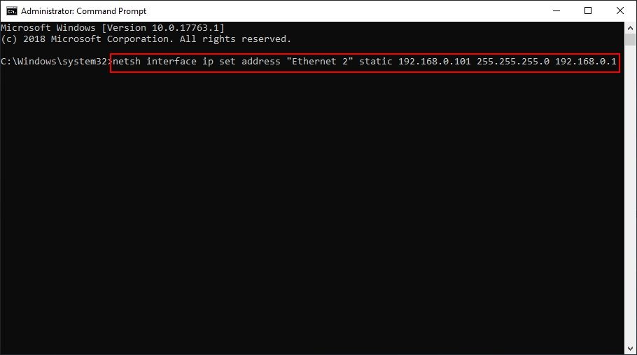 netsh interface ip set address "Ethernet 2" static 192.168.0.101 255.255.255.0 192.168.0.1