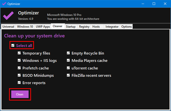 - On the "Cleaner" tab check the Select All checkbox and then click the "Clean" button (Figure 5).