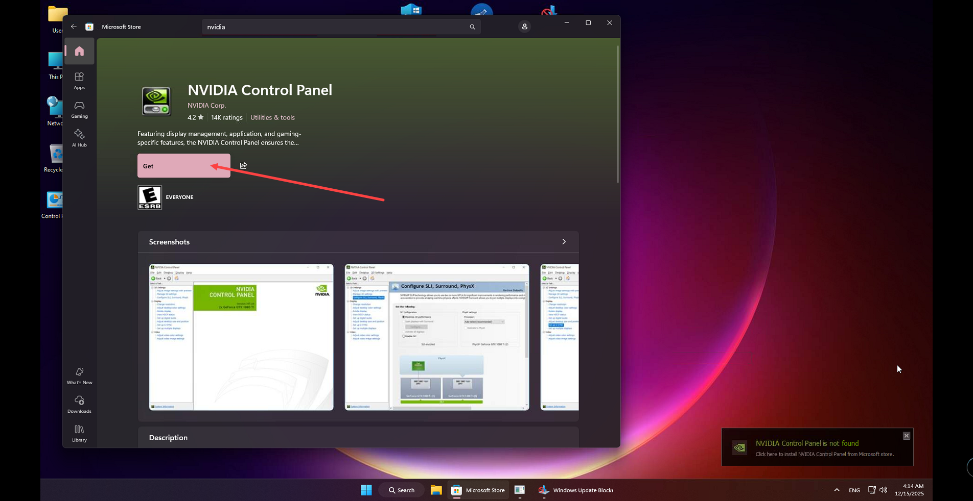- Then open the Microsoft Store, search for NVIDIA Control Panel, and click Get. This will download and install the NVIDIA Control Panel. (Figure 2)