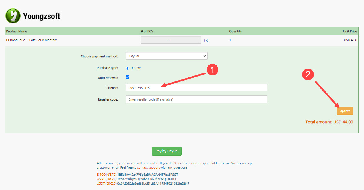 - Upon choosing the plan, an order page will appear. Add the license in the designated field, then click "update" as shown in (Figure 1).