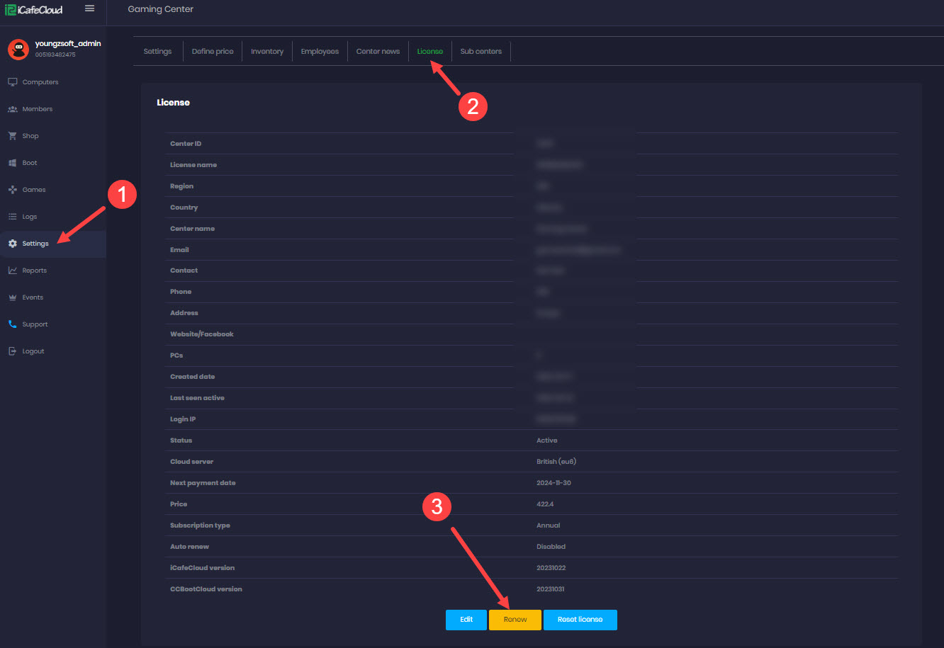 - Log in to Cp.icafecloud.com using your admin credentials.