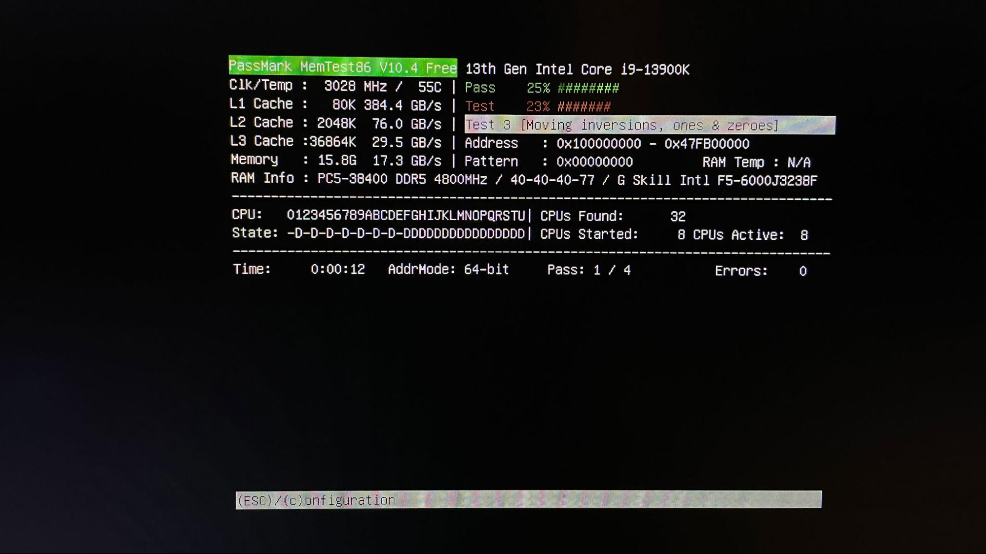 - Now let the application run the test until completion or until errors appear. You can monitor the progress of the test at the top of the screen. Testing can take 20 minutes to a few hours, depending on the capacity of your DIMM. If errors appear, there is no point in continuing testing.