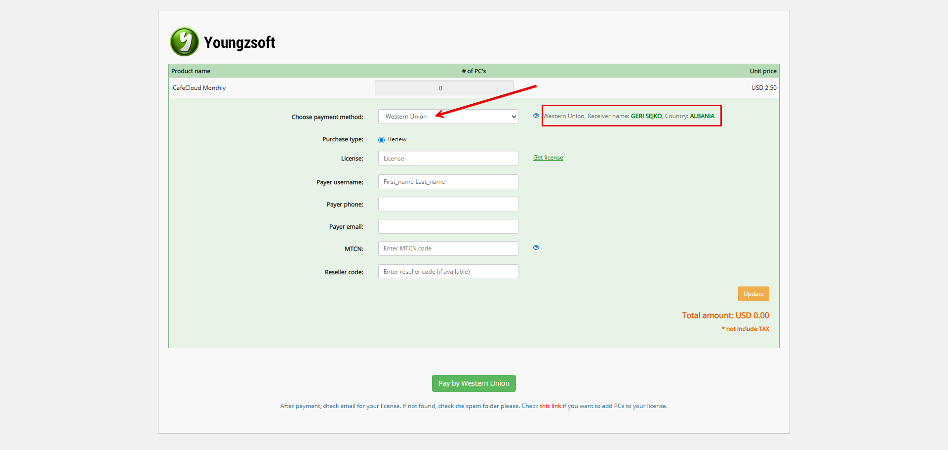 The following explains how to renew or pay for a license using payment method Western Union.